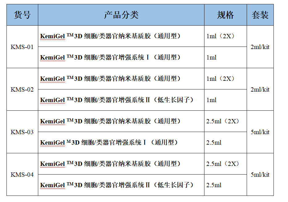 其中KemiGel ™3D細胞/類器(qì)官納米基質膠套裝包含基質膠(KemiGel ™納米基質膠)、基質膠增強系統(Enhancer I或Enhancer Ⅱ),可(kě)應用到3D細胞/類器(qì)官培養與微環境構建等;用戶可(kě)根據實際需要調整KemiGel ™納米基質膠濃度;本試劑盒操作(zuò)便利且可(kě)調控基質膠硬度進行(xíng)多(duō)種細胞培養測試等, 請(qǐng)操作(zuò)前詳細閱讀此3D細胞/類器(qì)官培養納米基質膠應用指南。