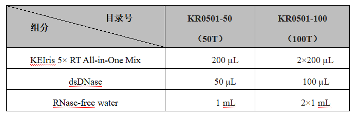 * KEIris 5× RT All-in-One Mix 包含以下組分:逆轉錄酶,RNA 酶抑制(zhì)劑,