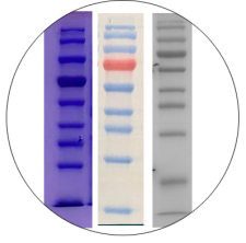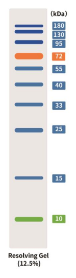本産品指示蛋白分子量範圍為(wèi)10-180kDa,在 SDS-PAGE和(hé)Western blotting中作(zuò)為(wèi)測定分子量大(dà)小(xiǎo)的标準品使用,可(kě)監測SDS-PAGE電(diàn)泳進程,評估轉移到 PVDF、尼龍和(hé)硝酸纖維素膜上(shàng)的轉移率,并在凝膠染色或使用 Western blot檢測試劑後估算(suàn)可(kě)見的分離蛋白的大(dà)緻分子量。